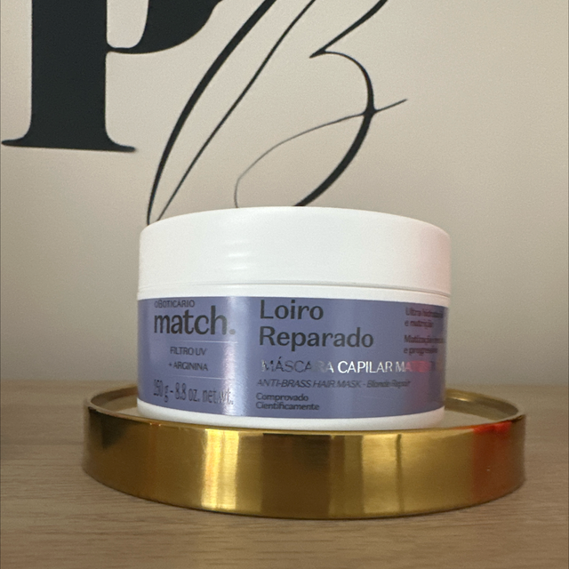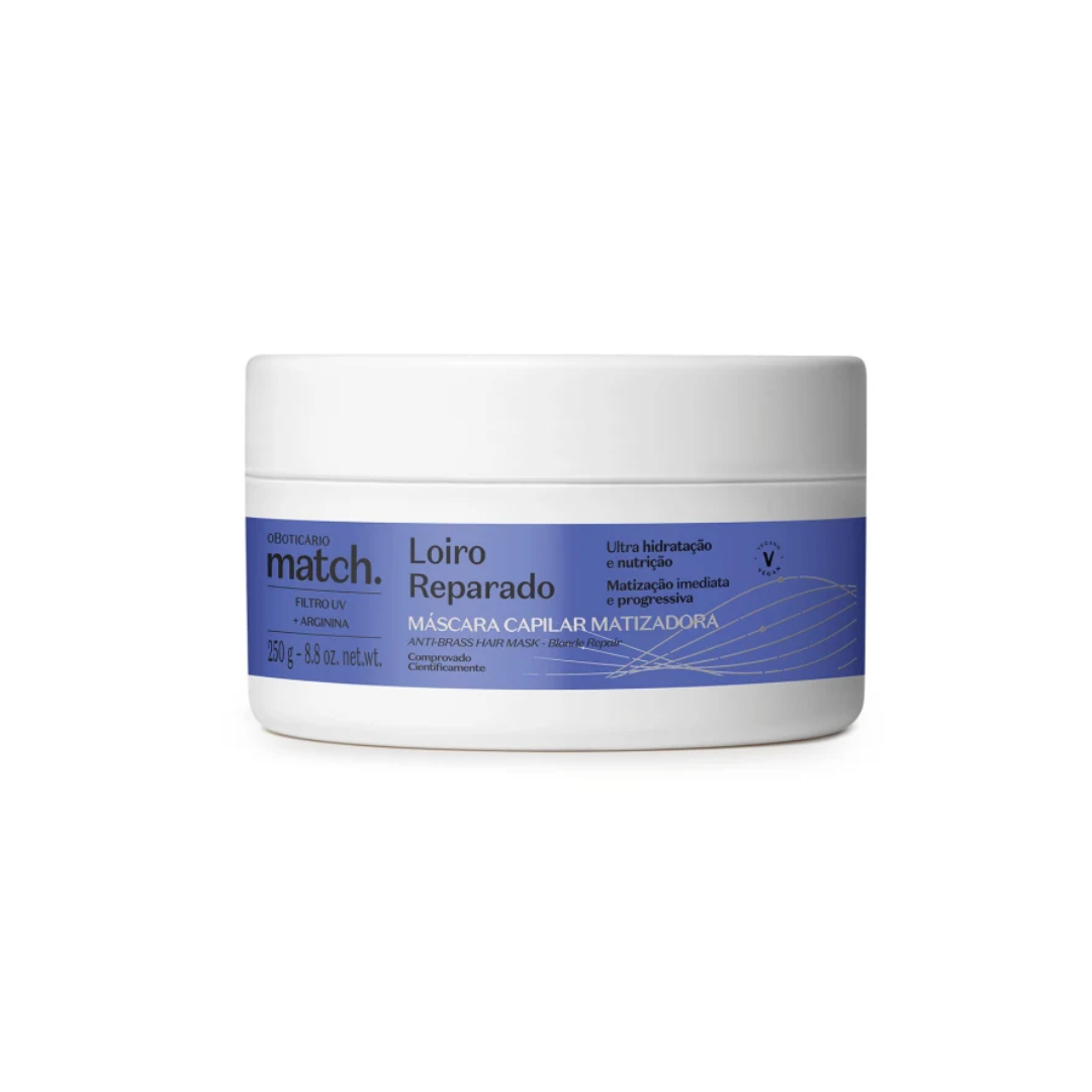 A Máscara Capilar Matizadora Match Loiro Reparado, de O Boticário, foi desenvolvida especialmente para cabelos loiros, descoloridos ou com mechas, que precisam de cor uniforme, reparação profunda e hidratação intensa.